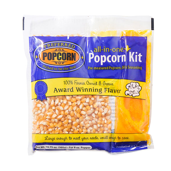 Our convenient all-in-one kits make it easy to enjoy movie theater popcorn at home. Simply pour the entire pouch into your popper and watch as the fluffy kernels pop to perfection. Each kit is perfectly seasoned for delicious results every time!